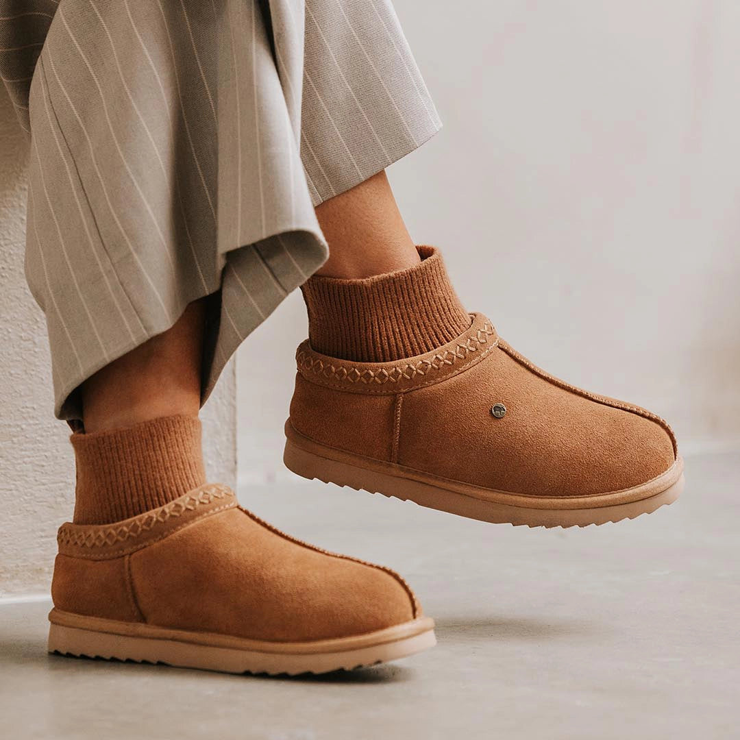 De opvallende sokkraag (cuff) geeft niet alleen een gezellige look, maar zorgt ook voor extra warmte rond je enkels. Perfect voor koude ochtenden en ontspannen avonden thuis.
